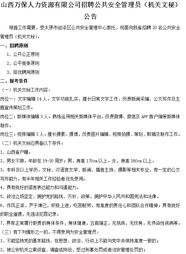 根據(jù)工作需要,經(jīng)古交市政府批準(zhǔn),現(xiàn)面向古交市公開招聘輔助工作人員30名。招聘工作由山西萬(wàn)保人力...